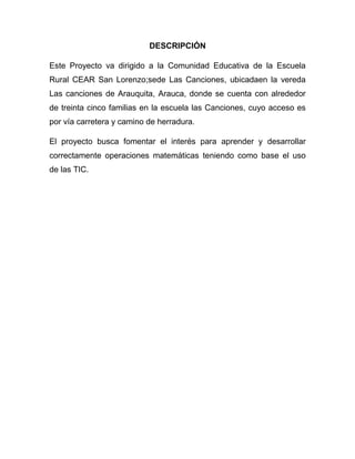 Este documento describe un proyecto para enseñar matemáticas a estudiantes en la Escuela Rural CEAR San Lorenzo usando el programa Scratch. El proyecto busca reducir los prejuicios sobre las matemáticas y mejorar la comprensión de sumas, restas y multiplicaciones a través de juegos interactivos.