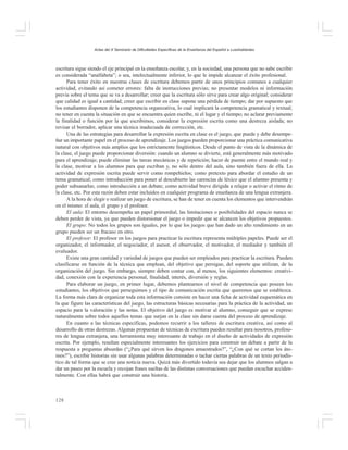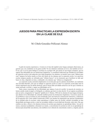 Este documento describe varios juegos para practicar la expresión escrita en clases de español como lengua extranjera. La autora señala que a los estudiantes generalmente no les gusta escribir y que los ejercicios tradicionales no han fomentado su interés. Propone usar juegos que motiven a los estudiantes a escribir de manera lúdica y creativa. Describe algunos ejemplos como árboles de relatos, binomios imaginativos e hipótesis imaginativas. El objetivo es ayudar a los