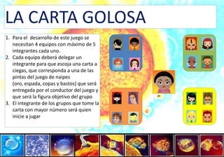 Este documento describe las reglas de un juego llamado "La Carta Golosa" que involucra 4 equipos de hasta 5 personas cada uno. Cada equipo escoge una carta objetivo al azar y el equipo con la carta de mayor valor comienza a jugar. El objetivo es derribar columnas de tarros que contienen cartas para recolectar 10 cartas de su figura objetivo. Los equipos tienen un número limitado de lanzamientos según el número obtenido en un lanzamiento inicial sobre una figura en forma de T. El primer equipo en completar su conjunto de