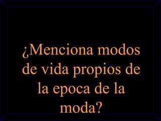 El documento presenta una serie de preguntas y respuestas cortas sobre temas relacionados con la moda, como modos de vida de diferentes épocas, beneficios buscados por la estructura narcisista del ego, ejemplos de modas de contestación, orígenes de la moda masculina y la edad de oro de la alta costura, entre otros.