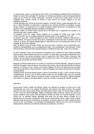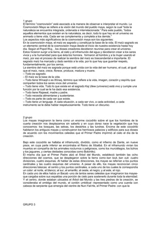 La cosmovisión maya concibe el universo como integrado y animado, donde todo está vivo y se complementa. Consideran sagrado al maíz como base de la vida. Creían que el mundo fue creado y destruido varias veces antes de la actual, la cual fue creada por el dios del maíz colocando el Árbol Cósmico y estableciendo las direcciones.