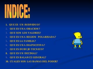 Este documento presenta 10 preguntas breves con respuestas sobre conceptos variados como individuo, oración, valores, región polarizada, familia, diapositiva, dibujo técnico, decimal, balance general y ramas del poder. Cada pregunta define uno de estos conceptos en una o dos oraciones de manera concisa.