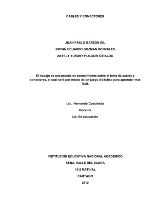 El documento presenta un juego didáctico sobre cables y conectores para aprender de forma más fácil. El juego consiste en una sopa de letras con palabras relacionadas a cables y conectores y preguntas para encontrar las respuestas en la sopa de letras.