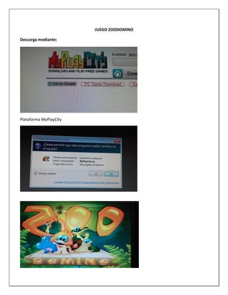 Este documento analiza el juego digital Zoodomino desde perspectivas pedagógicas y lúdicas. Explica que el juego fortalece la lógica del niño al emparejar animales en 15 niveles crecientes de dificultad. También discute la importancia del juego en el desarrollo infantil según teorías de Gros y Piaget. Compara ventajas de los juegos tradicionales como estimular la imaginación, con ventajas y desventajas de los videojuegos como promover razonamiento pero también posible
