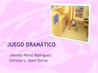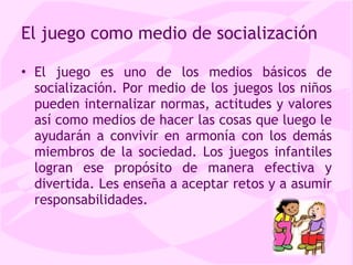 El documento describe las contribuciones del juego al desarrollo de los niños. El juego les permite a los niños internalizar normas y valores sociales. También desarrolla sus habilidades físicas, emocionales y sensoriales. El juego dramático en particular fomenta la imaginación, resolución de problemas, lenguaje y otras habilidades importantes.