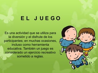 El documento describe el juego como una actividad recreativa importante para el desarrollo de los niños. Explica que el juego es innato, placentero y voluntario, y que a través del juego los niños exploran su entorno, descubren sus intereses y habilidades, y aprenden valores culturales. También destaca que el juego es crucial para el desarrollo cognitivo, social, emocional y físico de los bebés, ayudándolos a conectar con sus padres y entender el mundo.