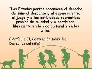 El documento discute el derecho de los niños al juego reconocido en la Convención sobre los Derechos del Niño. Resalta que el juego es fundamental para el desarrollo infantil ya que permite el desarrollo cognitivo, la expresión de emociones, la transmisión de valores y el aprendizaje de roles sociales. Asimismo, enfatiza la importancia de que los adultos valoren el juego y creen espacios y oportunidades para que los niños jueguen libremente.