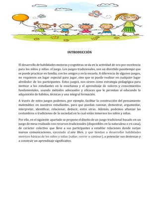 Este documento presenta un juego tradicional llamado "Arcoiris y Tormentas", el cual es una variación del juego de mesa "Serpientes y Escaleras". El juego se juega en un tablero dividido en casillas numeradas con arcoiris y tormentas que conectan diferentes casillas, y los jugadores avanzan tirando un dado. El propósito del juego es desarrollar habilidades motoras y valores como la honestidad y el respeto. El juego se origina en la India y tiene un significado moral asociado a las buenas y malas acc