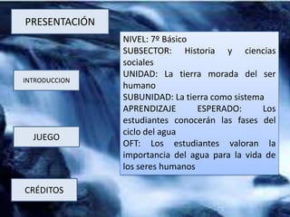 El documento presenta un juego didáctico sobre el ciclo hidrológico para estudiantes de 7o básico. El juego busca que los estudiantes conozcan las fases del ciclo del agua a través de preguntas sobre procesos como la evaporación, condensación, precipitación, infiltración y escorrentía.