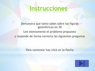 Este documento presenta un juego matemático que prueba el conocimiento de figuras geométricas en 3D haciendo preguntas sobre nombres, caras, vértices y formas de cuerpos geométricos como cilindros, prismas, cubos y paralelepípedos. El jugador debe responder correctamente a las preguntas haciendo clic.