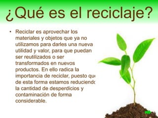 Este documento explica qué es el reciclaje y cómo hacerlo correctamente. Define el reciclaje como darle una nueva utilidad a los materiales y objetos que ya no se usan para reducir la contaminación. Explica que existen diferentes contenedores para depositar desechos según su composición, como desechos orgánicos, vidrios, papeles, latas, plástico y propone practicar el reciclaje en familia en el jardín para reutilizar cosas que ya no se usan.