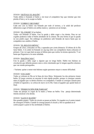 Este documento presenta una lista de juegos para diferentes deportes como badminton, baloncesto, balonmano, fútbol, voleibol. En total se describen más de 50 juegos modificados o alternativos que pueden usarse en clases de educación física para practicar diferentes habilidades motrices y trabajar en equipo de manera divertida. Los juegos propuestos varían la dinámica y las reglas tradicionales de cada deporte para adaptarlos a diferentes niveles y edades.