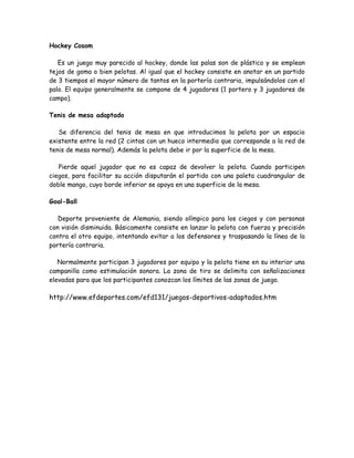 Este documento describe varios juegos deportivos adaptados que son adecuados para personas con diferentes discapacidades. Algunos de los juegos mencionados son bowling, bádminton adaptado, hockey cosom, tenis de mesa adaptado y goal-ball, los cuales han sido modificados para facilitar la participación de personas ciegas, con deficiencias psíquicas o discapacidad motriz. Estos juegos adaptados ofrecen una forma de recreación e integración a través del deporte.