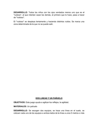 Este documento presenta varios juegos rompehielo y tradicionales para realizar con niños. Describe los objetivos, materiales necesarios y desarrollo de cada juego de manera concisa. Algunos juegos buscan ayudar a los niños a ganar confianza en sus movimientos, agilizar sus reflejos, romper el hielo, desarrollar habilidades psicomotoras y favorecer la integración de un grupo.