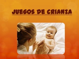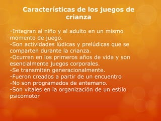 Este documento describe diferentes tipos de juegos de crianza que ocurren entre niños y adultos en los primeros años de vida. Incluye juegos de sostén que involucran contacto físico como hamacas o caballitos, juegos de ocultamiento donde personas u objetos se esconden, y juegos de persecución con roles de perseguidor, perseguido y refugio que requieren confianza entre el niño y adulto. Estos juegos son vitales para el desarrollo psicomotor del niño y se transmiten de generación en
