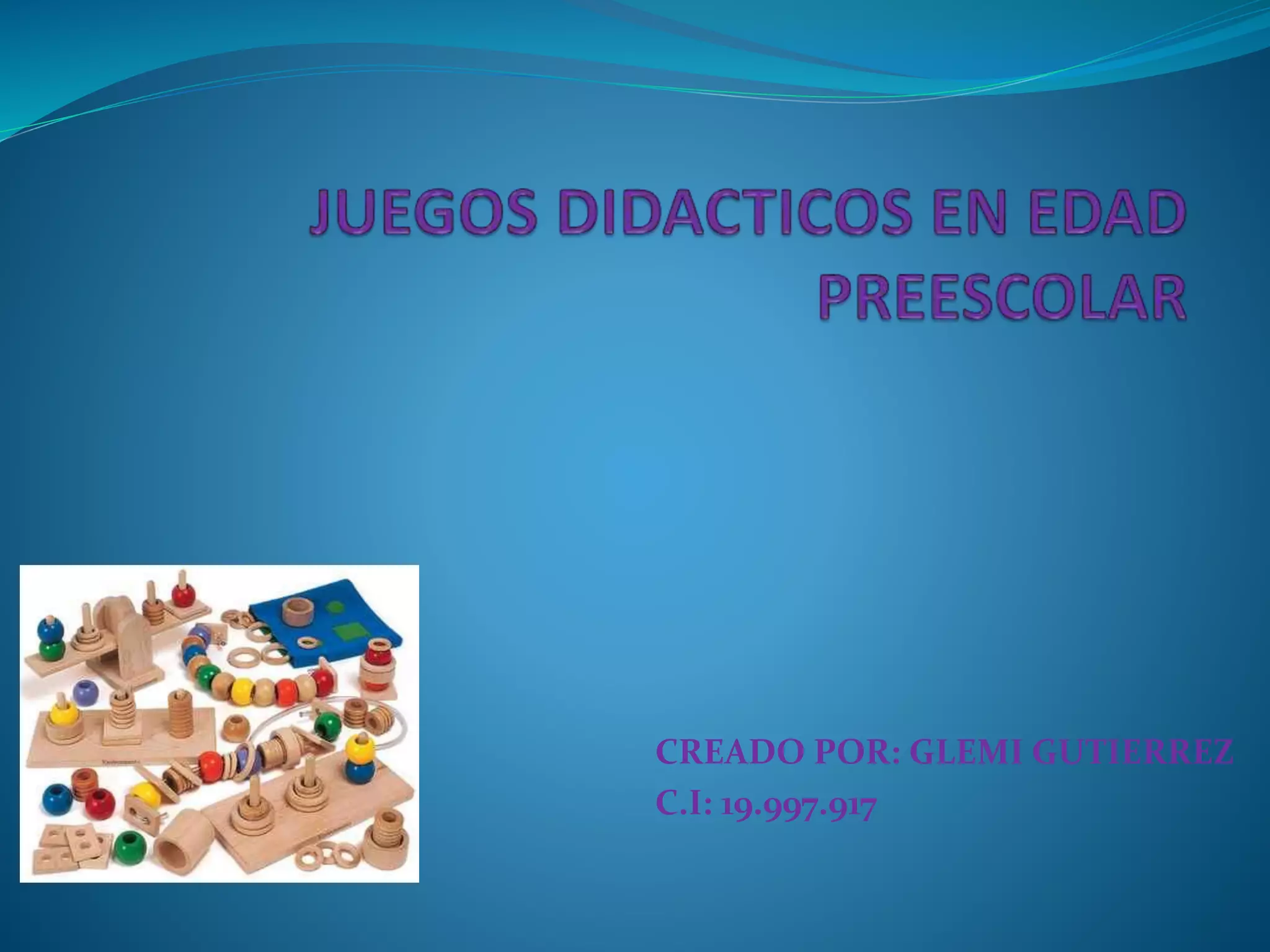 Este documento describe los juegos didácticos en la edad preescolar y sus beneficios. Explica que los juegos deben estimular la madurez intelectual y desarrollar habilidades psicomotoras a través de la manipulación de objetos. Identifica cinco tipos de juegos infantiles y destaca que los juegos promueven la alegría, son espontáneos e imitan acciones de adultos. Finalmente, resume la teoría de Piaget sobre tres tipos de juego y su papel en el aprendizaje del