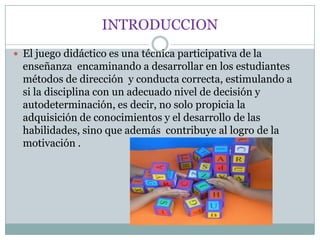 Este documento describe los juegos didácticos y sus características. Los juegos didácticos despiertan el interés hacia las asignaturas, se utilizan para fortalecer y comprobar los conocimientos adquiridos en clases, y aceleran la adaptación de los estudiantes a los procesos sociales dinámicos de su vida. Los juegos didácticos se clasifican en juegos para el desarrollo de habilidades, juegos para la consolidación de conocimientos, y juegos para el fortalecimiento de valores