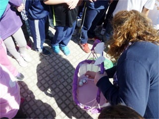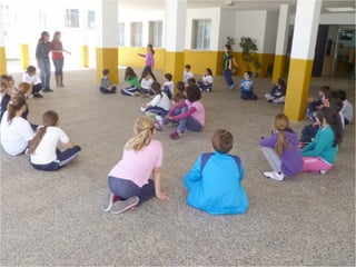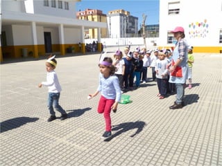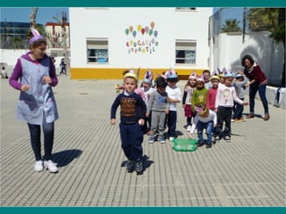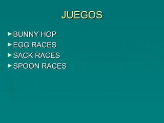 El documento describe las actividades de juegos del colegio CEIP "Gadir" para la Pascua de 2015, incluyendo Bunny Hop, Egg Races, Sack Races y Spoon Races. Cada actividad consistía en una carrera con un elemento de Pascua como conejos, huevos, sacos o cucharas.