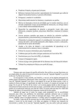 Este documento presenta dos juegos interactivos creados con Neobook para niños de Educación Infantil y Especial: "La flor de las letras" y "Aprende jugando". "La flor de las letras" ayuda a aprender y reforzar la lectoescritura con actividades sobre cada letra del abecedario. "Aprende jugando" trabaja conceptos como colores, formas y números, y cuenta con instrucciones en lenguaje de signos para niños sordos. Los juegos usan sonidos, imágenes y vídeos