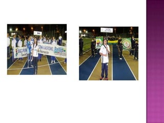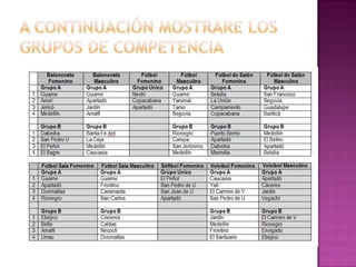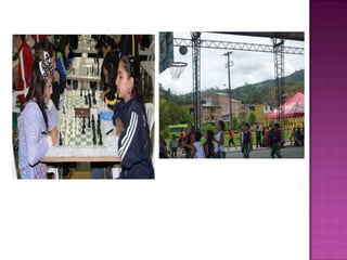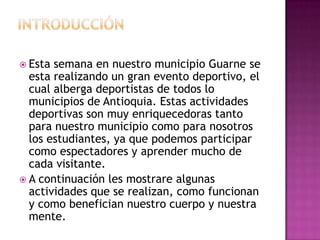 Este documento describe un evento deportivo que se está llevando a cabo en el municipio de Guarne, Antioquia, Colombia. El evento incluye competiciones de 16 deportes diferentes y cuenta con la participación de 2094 deportistas de 70 municipios de Antioquia. El documento también brinda detalles sobre los beneficios de la actividad física, las lesiones deportivas comunes, y las dimensiones reglamentarias de varios deportes.