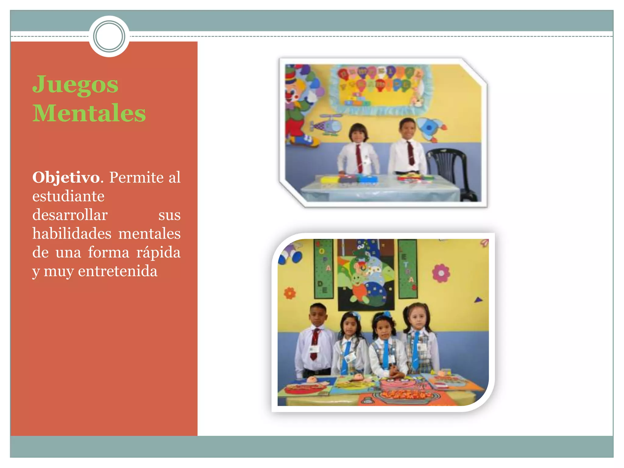 Este documento describe tres juegos mentales para estudiantes: 1) Un juego numérico de pirámides para desarrollar habilidades de cálculo mental con números pequeños, 2) Un juego de palabras como sopa de letras o formación de oraciones para estimular la atención y concentración, 3) Un juego de deletreo donde los estudiantes observan imágenes y deletrean rápidamente los nombres para mejorar su vocabulario y pronunciación.