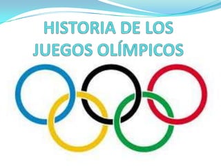 Este documento proporciona una breve historia de los Juegos Olímpicos antiguos y modernos. Comenzaron en Olimpia, Grecia en 776 aC y se celebraron cada cuatro años hasta 393 dC cuando fueron prohibidos. Fueron revividos por Pierre de Coubertin en 1896 en Atenas. Ahora se celebran cada cuatro años en verano e invierno y son gestionados por el Comité Olímpico Internacional con sede en Suiza.