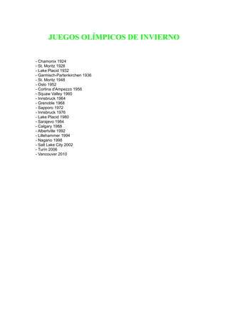 Este documento lista las ciudades sede de los Juegos Olímpicos de verano e invierno desde 1896 hasta 2012. Incluye información sobre las suspensiones de los juegos de 1916, 1940 y 1944 debido a las guerras mundiales. También destaca que Londres, París y Los Ángeles han albergado los juegos olímpicos de verano en más de una ocasión.