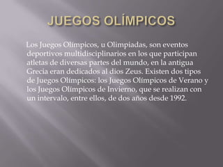 Los Juegos Olímpicos modernos se originaron en la antigua Grecia como competencias deportivas y religiosas en honor a Zeus. Pierre de Coubertin revivió los Juegos Olímpicos en 1896 en Atenas con la participación de atletas de varios países. Desde entonces, los Juegos Olímpicos de Verano se celebran cada cuatro años en diferentes ciudades alrededor del mundo y reúnen a miles de atletas para competir en varios deportes.