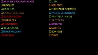 Este documento presenta una lista de términos relacionados con el lenguaje de programación Scratch. Algunos de los términos mencionados son bloques, disfraces, objetos, escenarios, paleta de bloques y área de programación.