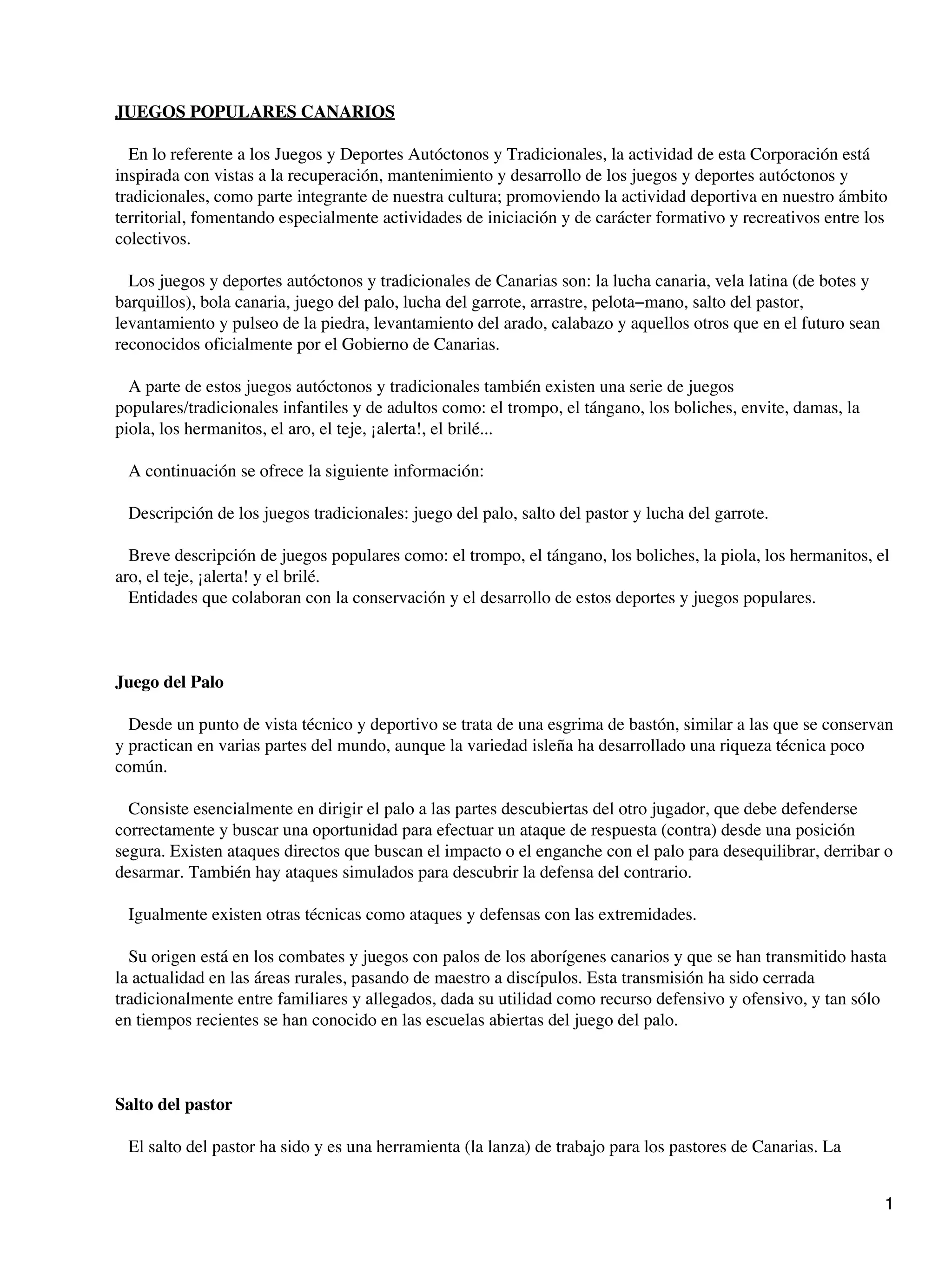 Los juegos populares canarios tradicionales incluyen la lucha canaria, vela latina, bola canaria, juego del palo, lucha del garrote y arrastre. También existen juegos populares infantiles como el trompo, los boliches, la piola, los hermanitos, el aro y el teje. Estas tradiciones se conservan para preservar la cultura canaria.