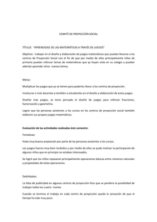 El documento describe el objetivo y metas de un comité dedicado a diseñar y elaborar juegos matemáticos para niños en centros de proyección social. El comité busca multiplicar los juegos existentes, involucrar a más docentes y estudiantes en su diseño, y crear juegos nuevos para temas como fracciones y geometría. También busca que los asistentes a los cursos creen sus propios juegos. La evaluación señala fortalezas como la buena aceptación de los juegos pero también debilidades como falta de
