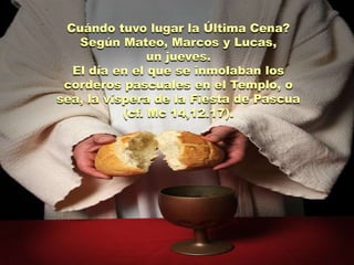 El documento analiza la cronología de los últimos días de Jesús según los diferentes evangelios. Juan indica que la Última Cena no fue la cena pascual judía, sino que ocurrió un día antes, por lo que Jesús fue crucificado el día anterior al comienzo de la Pascua judía. La Última Cena de Jesús instituyó una nueva Pascua cristiana relacionada con su muerte y resurrección, no con el rito pascual judío.