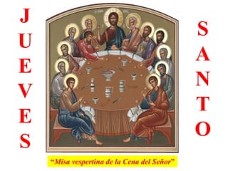 La misa vespertina del Jueves Santo conmemora la Última Cena de Jesús con sus discípulos. La liturgia incluye lecturas que recuerdan la Pascua judía y la institución de la Eucaristía, el lavatorio de pies, y la reserva eucarística hasta la medianoche cuando comienza la memoria de la pasión. La celebración introduce el Triduo Pascual culminando en la Vigilia Pascual.