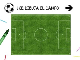 El documento describe los pasos para jugar un partido de fútbol, incluyendo dibujar el campo, colocar las posiciones de los jugadores, determinar el área de cada jugador y equipo, y observar qué equipo tiene ventaja en la jugada.