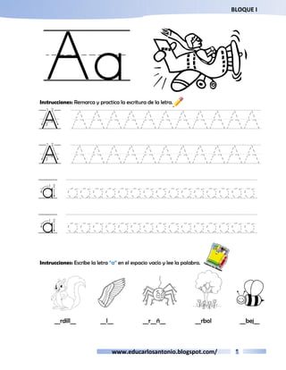 Este documento contiene instrucciones para practicar las letras del alfabeto a través de ejercicios como remarcar, escribir, completar palabras, unir dibujos y nombres, recortar y pegar, etc. Las instrucciones van guiando al lector en la práctica de cada letra de la A a la T a través de sílabas, palabras y oraciones cortas.