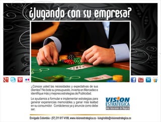 El documento ofrece servicios de consultoría para empresas en Envigado, Colombia, enfocados en identificar las necesidades de los clientes y mejorar estrategias de publicidad. Se promueve la importancia de generar experiencias memorables para aumentar la lealtad del consumidor. Se incluye información de contacto para interesados en implementar dichas estrategias.