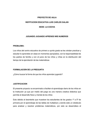 Este documento describe un proyecto de aula llamado "Jugando Jugando Aprendo Mis Números" diseñado para ayudar a estudiantes de primero a quinto grado en el Centro Educativo La Cocha a aprender las cuatro operaciones básicas de matemáticas de manera divertida a través de juegos y las TIC. El proyecto busca desarrollar estrategias lúdicas para superar la falta de interés de los estudiantes en aprender tablas de multiplicación y resolver problemas matemáticos.