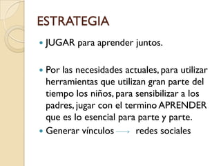 La estrategia propone un juego virtual donde los niños pueden avanzar comprando computadores para donar mediante el uso de monedas virtuales. El juego involucra aprender sobre nuevas culturas, interactuar con otros usuarios, y completar desafíos de lógica e inteligencia para atraer a los niños al aprendizaje. Además, los padres pueden donar dinero para que sus hijos ayuden a una causa mientras aprenden. El niño que done un computador podrá comunicarse vía Skype con el niño que recibió la don