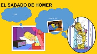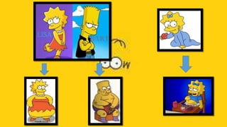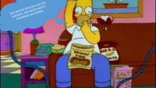 Este documento habla sobre la alimentación de Homer Simpson y su familia. Explica que Homer come demasiadas grasas y azúcares, por lo que el Dr. Hibbert le aconseja comer de forma equilibrada, hacer ejercicio regularmente, tomar más frutas y verduras, y dividir sus comidas en 5 por día para mejorar su salud.