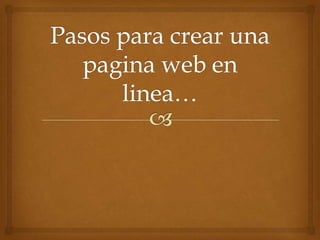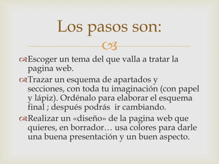 Los pasos para crear una página web son escoger un tema, trazar un esquema de secciones con papel y lápiz, diseñar la apariencia de la página con colores, obtener espacio en un servidor gratuito o de pago, crear una carpeta para los archivos, instalar un programa de diseño web, comenzar el diseño en el programa, actualizar la página en el servidor, y promocionar la página.