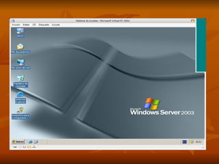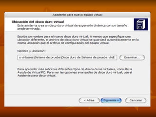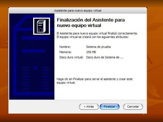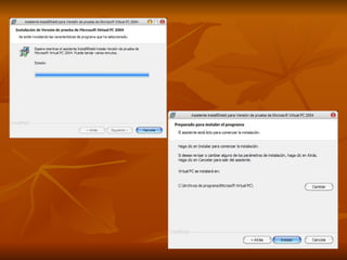 El documento describe los pasos para crear una máquina virtual e instalar Windows XP en ella, incluyendo encender el computador, insertar el CD, ejecutar el programa de máquina virtual, crear un equipo virtual, seleccionar Windows XP, asignar RAM y un disco duro virtual, e iniciar la instalación de Windows XP siguiendo los pasos guiados en pantalla.