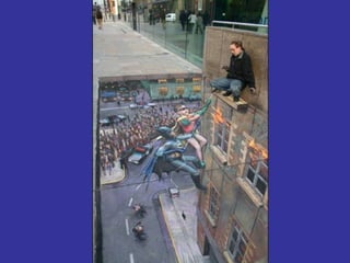 Este documento presenta los dibujos en tres dimensiones de Julian Beever hechos con tiza que parecen cobrar profundidad desde ciertos ángulos. Muestra varios dibujos increíbles de Beever que se ven como esculturas tridimensionales a pesar de ser sólo trazos en el piso, y concluye con un dibujo de una bestia.