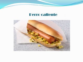 Este documento habla sobre perros calientes y hamburguesas. Explica cómo preparar un perro caliente colombiano abriendo los panes, cocinando las salchichas y decorándolas con salsas y papas fritas. También describe cómo hacer una hamburguesa mezclando carne, huevo, aliños y sal en la licuadora y friendo las bolas de carne formadas. Menciona diferentes tipos de hamburguesas como las de comida rápida y las Whopper.