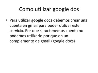 Google Docs ofrece almacenamiento en la nube y herramientas de productividad como procesadores de texto y presentaciones para colaborar y compartir documentos desde cualquier dispositivo. Para usar Google Docs se requiere una cuenta de Gmail, ya que es un complemento de Gmail que permite subir y editar documentos, hojas de cálculo y presentaciones en la nube para trabajar en grupo de forma remota.
