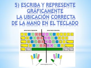 El documento describe las diferentes partes del teclado y sus funciones, incluyendo teclas alfanuméricas, de funciones, numéricas y de control. También discute la postura correcta al usar el teclado y cómo prevenir lesiones musculares.