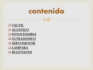 Este documento describe diferentes sensores y actuadores que pueden usarse con un robot LEGO Mindstorms NXT. Brevemente describe los siguientes: sensor táctil para detectar obstáculos, sensor acústico para medir niveles de sonido, sensor fotosensible para medir luz y color, sensor ultrasónico para medir distancias, servomotores para mover al robot, lámparas para indicar estados, y Bluetooth para comunicación inalámbrica.