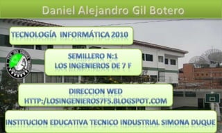 El documento presenta información sobre Daniel Alejandro Gil Botero, un estudiante de tecnología informática del 2010 que pertenece al semillero N°1 llamado "Los Ingenieros de 7f" en la Institución Educativa Técnico Industrial Simona Duque. Se incluye su nombre, carrera, año de estudio, semillero al que pertenece y la institución educativa.