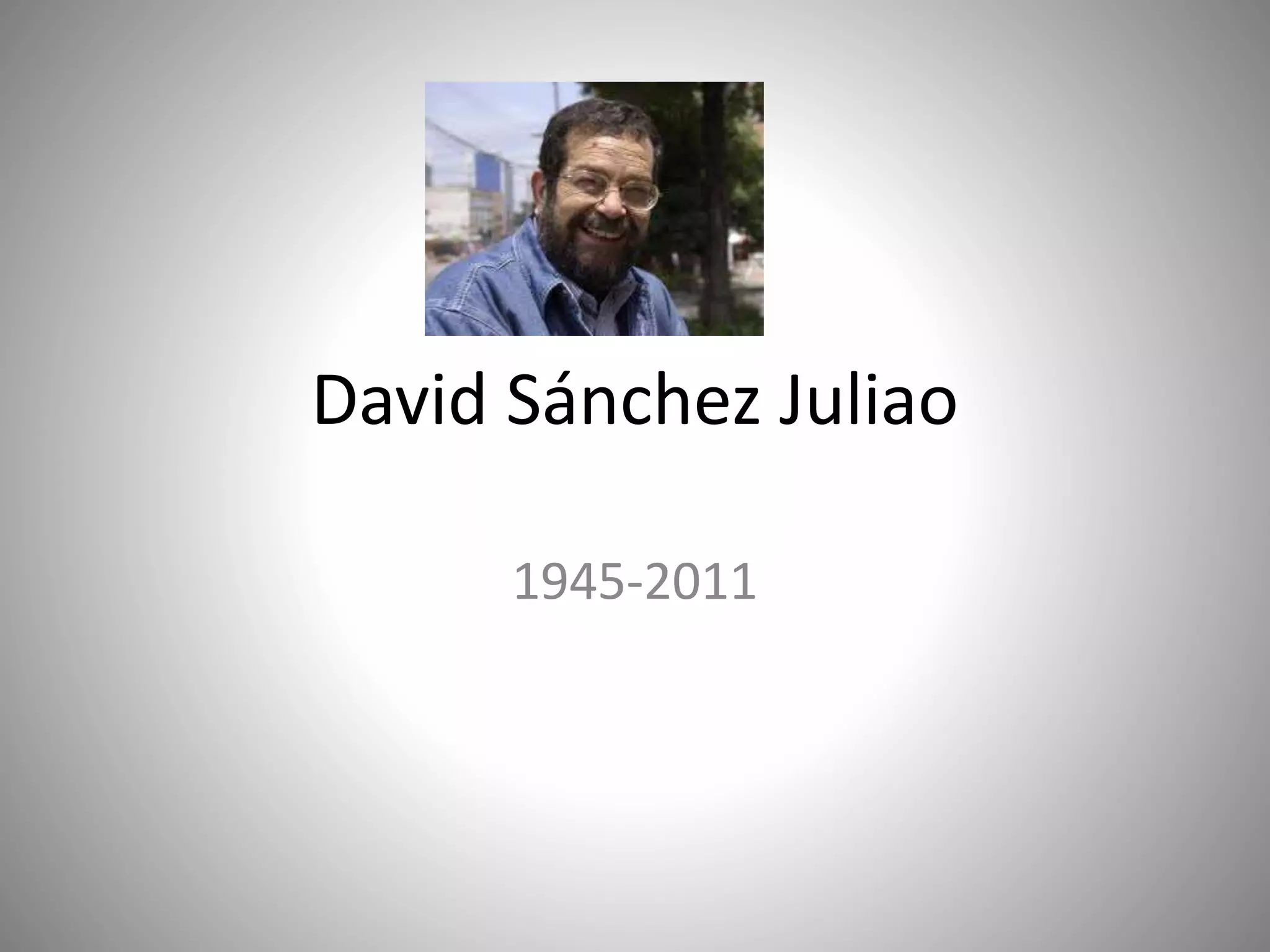 David Sánchez Juliao (1945-2011) fue un escritor colombiano reconocido por su amplia obra literaria que incluye novelas, cuentos y fábulas, y ha recibido múltiples premios nacionales e internacionales. Además de ser galardonado en literatura, sus obras han sido adaptadas para cine y televisión, obteniendo varios premios y traducciones a doce idiomas. A lo largo de su vida, se desempeñó como profesor invitado en diversas universidades alrededor del mundo.