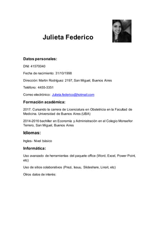 La hoja de vida presenta los datos personales y la formación académica de Julieta Federico, una estudiante de licenciatura en obstetricia de la Universidad de Buenos Aires. Completó sus estudios secundarios en el Colegio Monseñor Terrero y actualmente cursa su carrera universitaria. Domina el paquete office y herramientas colaborativas en línea.