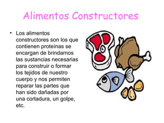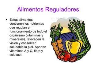 Este documento clasifica los alimentos en tres categorías: alimentos reguladores que contienen vitaminas y minerales para regular el funcionamiento del cuerpo y mantener la salud de la piel y la visión; alimentos constructores que contienen proteínas para construir y reparar los tejidos del cuerpo; y alimentos energéticos que proporcionan energía extra para periodos de gran esfuerzo físico.